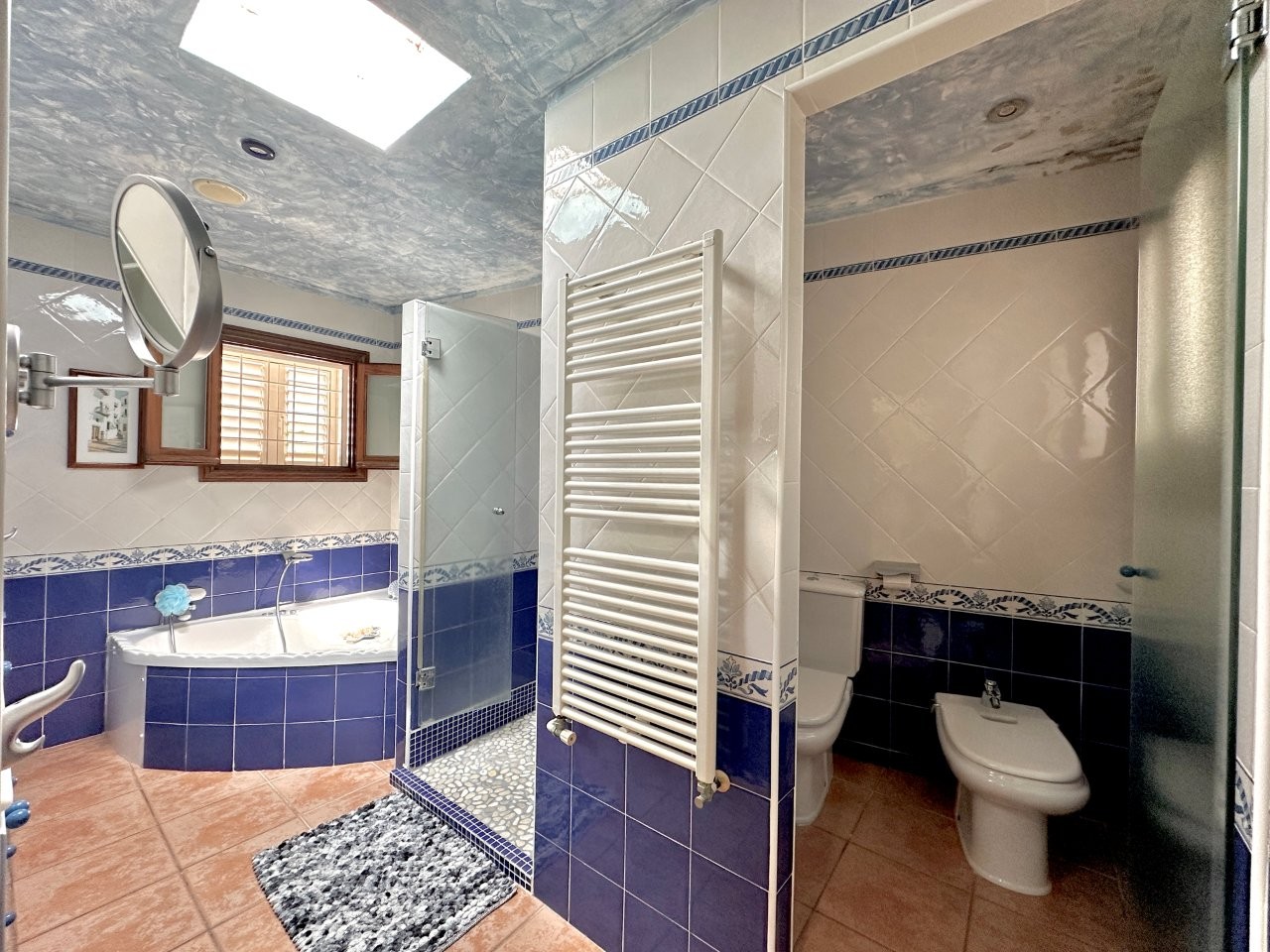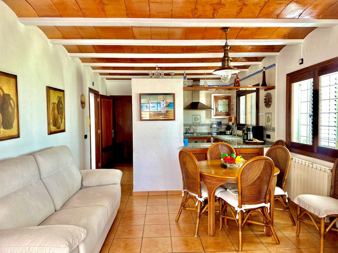 The house offers four bedrooms and three bathrooms. The kitchen is connected to the living room, creating a functional layout. There is also an annex that can be used for guests or staff.