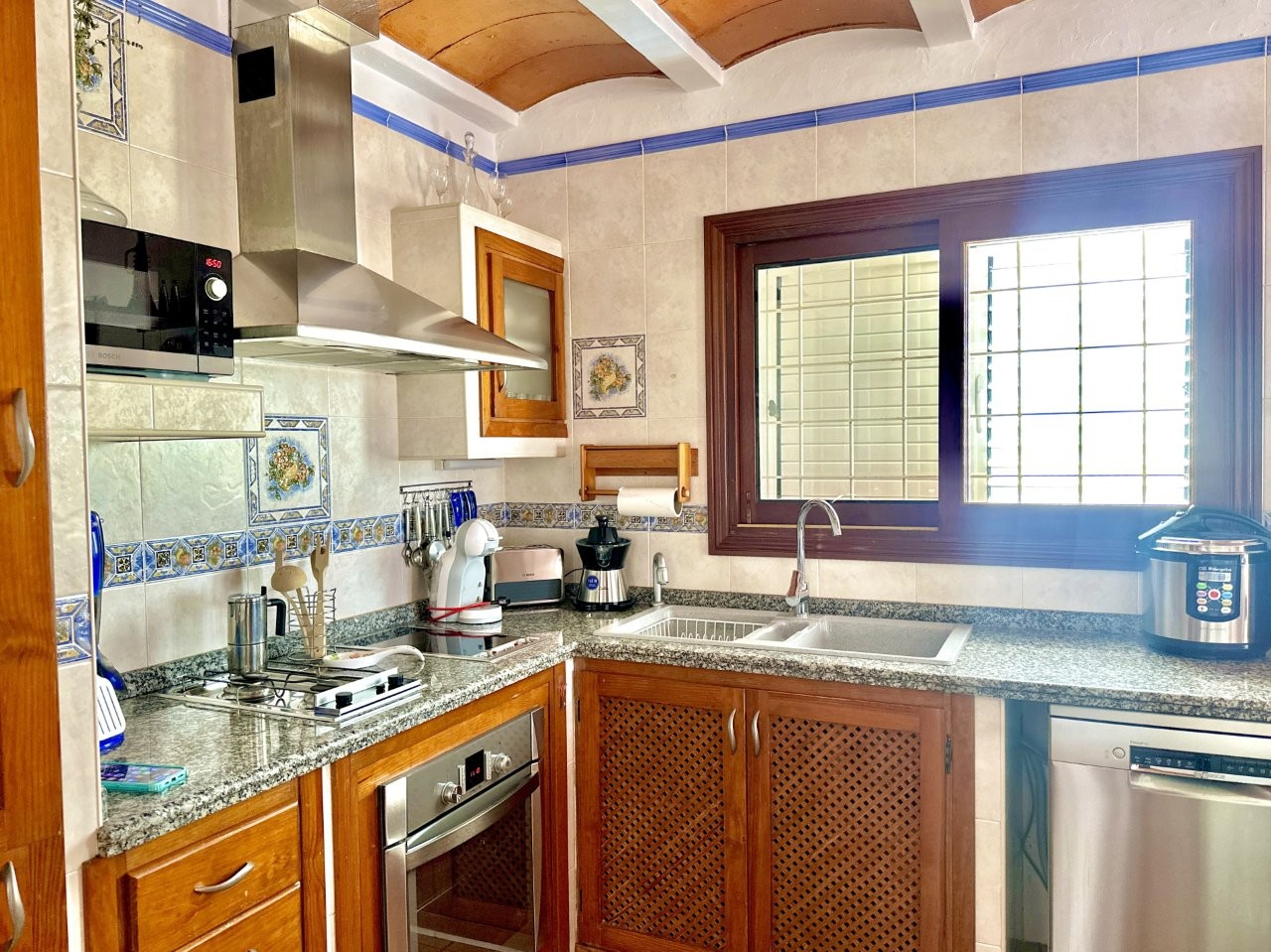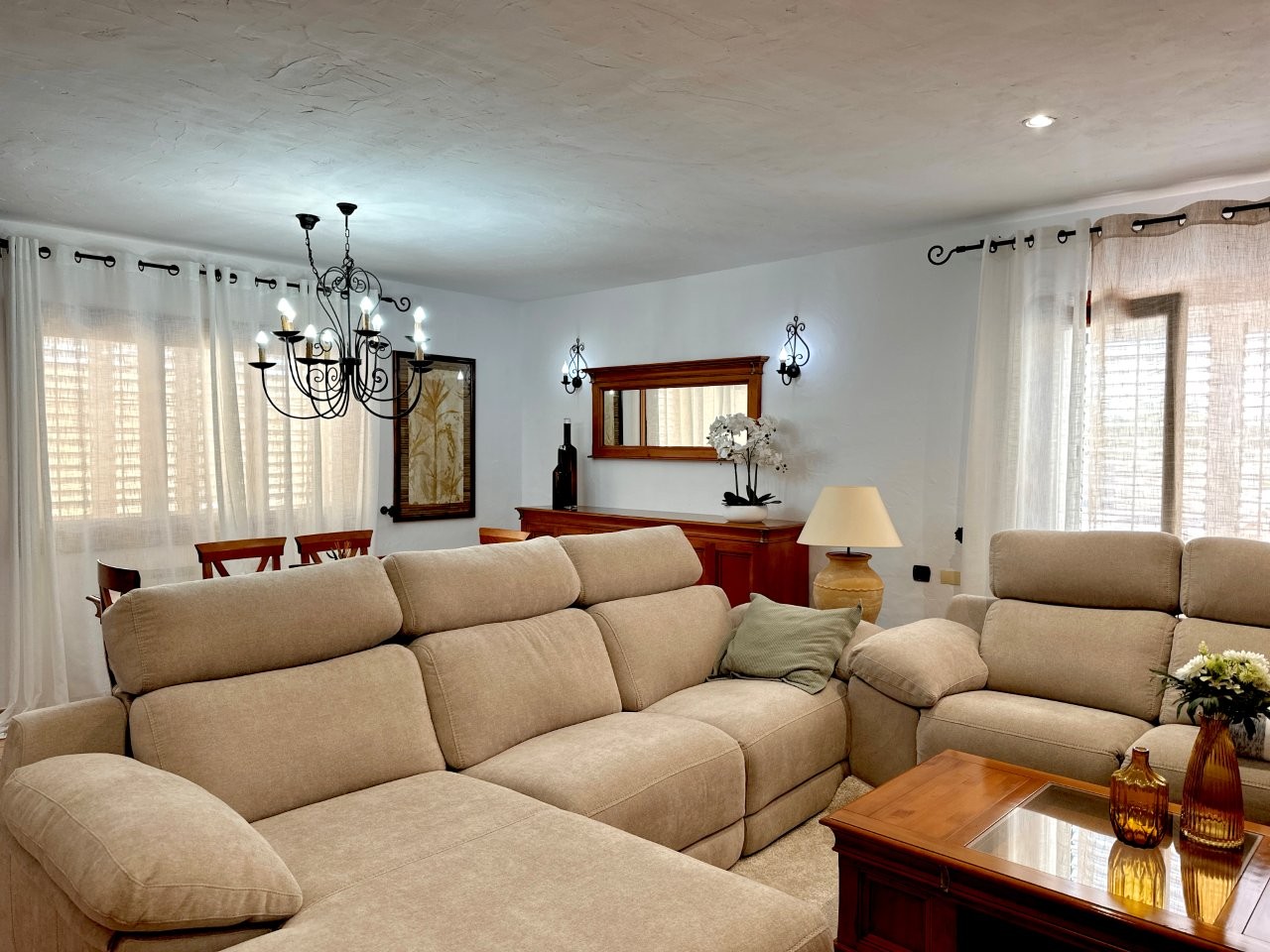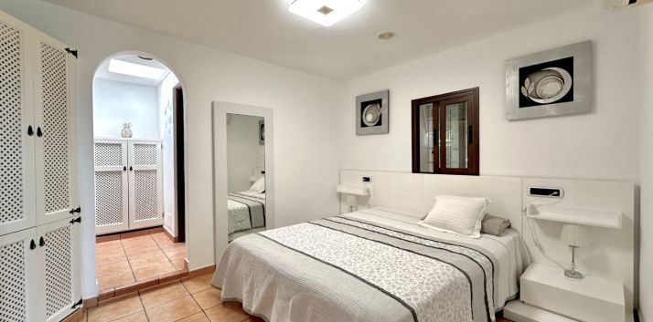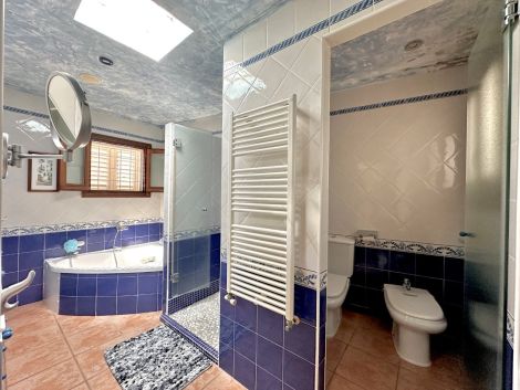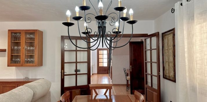 La casa cuenta con cuatro dormitorios y tres baños. La cocina está conectada con el salón, lo que crea una distribución funcional. También hay un anexo que se puede utilizar para invitados o personal.
