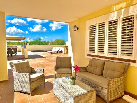 Esta villa está situada en el centro de Santa Gertrudis, con todos sus servicios cerca. La propiedad tiene una superficie construida de 343 m² en una parcela de 726 m².